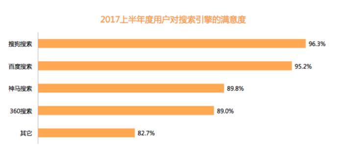 差异化产品布局的日益丰富及人工智能领域的持续投入,不仅进一步巩固了搜狗搜索行业第二的地位,也使搜狗搜索的用户满意度得到了提升。据报告显示,上半年搜狗搜索用户满意度为96.3%,处于行业首位。