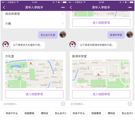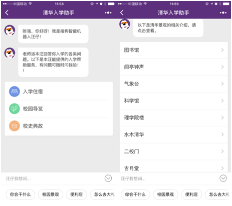 近日,针对大学校园环境中信息量大、来源分散、查询困难等问题,搜狗搜索联合清华大学共同研发出一款基于人工智能(AI)技术的对话式智能自助应用——“清华入学助手”。“清华入学助手”面向校园应用场景,以智能对话的交互方式,为入学新生提供公寓服务指南、校内地点查询和校史讲解等咨询服务,回答学生提出的各种问题,帮助入学新生快速熟悉校园生活。
