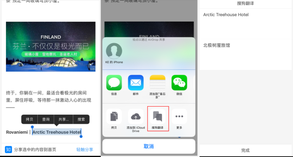 尝过了异域的美食,看过了境外的美景,你可能还会想通过手机了解这些美食和美景的更多信息。如果搜到的是全英文资料,可使用搜狗翻译APP的文本翻译功能翻译成中文再阅读。此功能可支持高达5000字的输入,意味着即便是一篇完整的中英文文章,也能直接提供高质量的译文结果。而如果搜到的是中文资料,里面夹杂着看不懂的英文,还能使用搜狗翻译APP新上线的跨软件取词功能,不用切换软件就能提供精准翻译结果。如去北欧看极光,是很多年轻人的梦想,在其他APP上查询北欧极光的资料时,看到了“Arctic Treehouse hotel”这个词,只需长按并选中该字段,点击“共享”-“搜狗翻译”,即能在浮层中呈现精准释义:“北极树屋宾馆”。阅读完翻译结果点击“完成”按钮,即可回到此前的阅读界面,不打乱正常的阅读顺序。