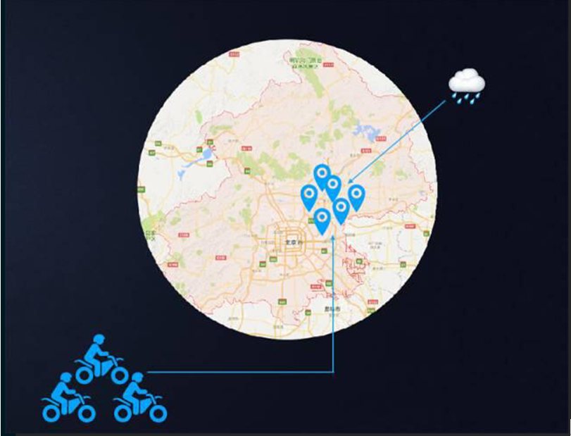 在饿了么与墨迹天气的合作里,双方通过打通数据建立配送模型,该模型基于三大块数据而来:历史短时预报数据、历史外卖配送数据以及最新短时预报数据,基于该模型饿了么可制定未来2小时的配送计划,降低天气因素对外卖订单的损失。