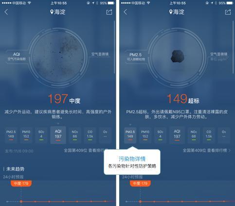 天气通可以为用户提供未来7天空气质量指数趋势,同时还可以展示出当前空气中6种主要污染物的实时数据。值得关注的是,除了告知用户具体数据,天气通还会针对6种不同污染物为用户提供相应的防护措施建议。