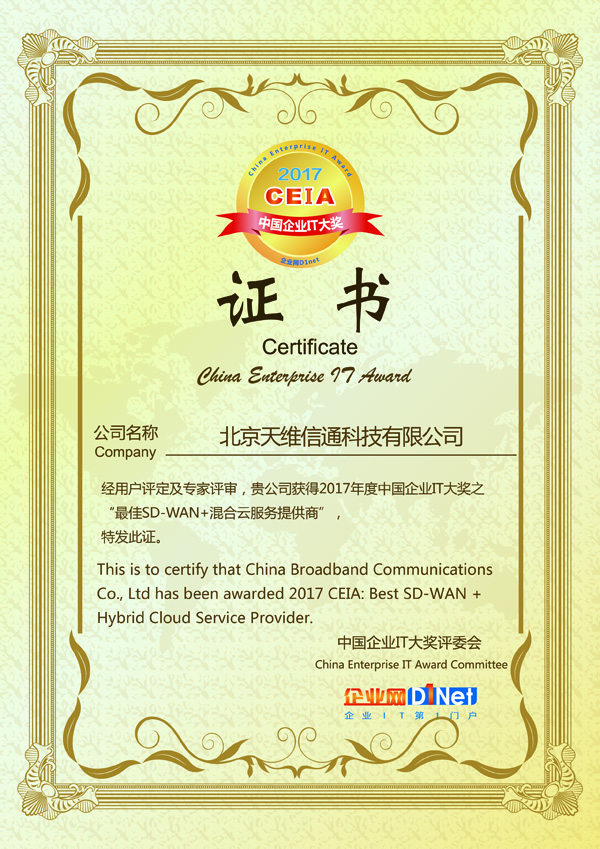 天维信通荣膺“2017 CEIA最佳SD-WAN+混合云服务提供商”大奖