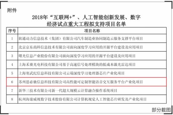 凭借稳健的研发实力和广泛的市场落地,思必驰“高性能可定制智能语音交互服务平台产业化项目”入围了国家发展改革委“2018年互联网+、人工智能创新发展、数字经济试点重大工程支持项目名单”。这既是对人工智能语音技术前景的看好,也是对思必驰的极大肯定!