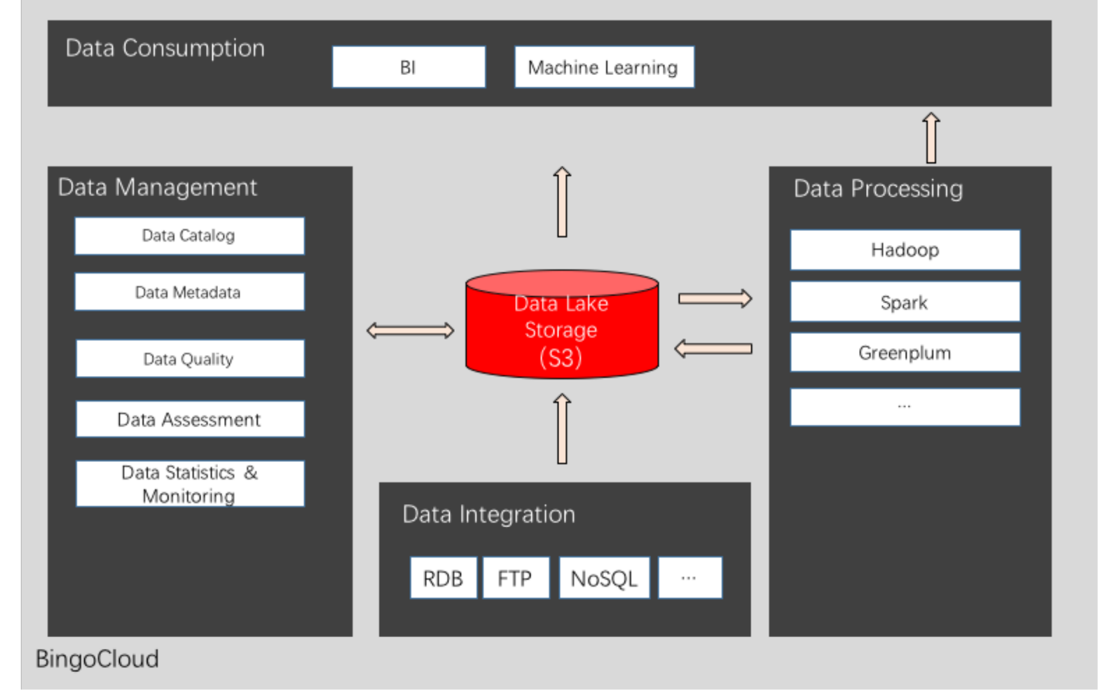 Relying on BingoCloudOS, Bingo Data Lake helps enterprises establish their data lakes on the basis of S3 Object-based Storage, providing universal data supporting environments for the exchange of data resources and the innovation of data applications among different departments, branches, organizations, and industries. Specifically, Bingo Data Lake offers one-stop services covering the storage, integration, processing, management, and consumption of data, and can serve the whole life cycle of the data.