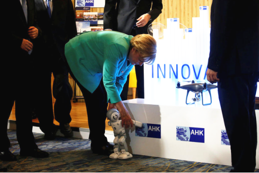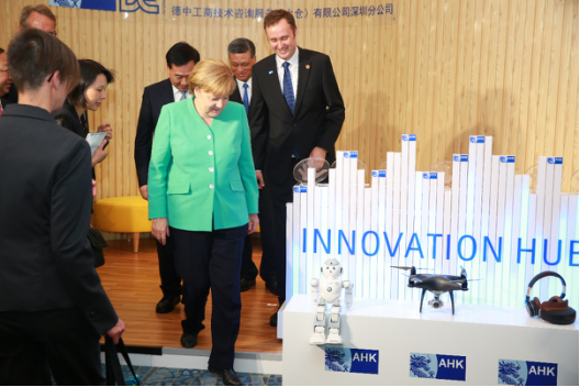 5月25日,德国总理默克尔出席德国工商会深圳创新中心揭幕仪式,德国联邦经济与能源部国务秘书鲁斯鲍姆、广东省委书记李希、广东省省长马兴瑞、深圳市委书记王伟中、中国驻德国大使史明德也一同出席了揭幕仪式,优必选Qrobot Alpha机器人作为深圳最具代表性的高科技产品之一在揭幕仪式上亮相,引起了默克尔总理极大的兴趣。