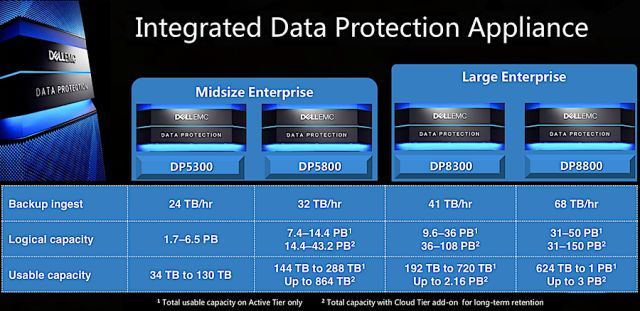 IDPA采用了一体化的机架系统设计,融合存储、保护软件、搜索和分析诸多组件,目前主要分为四个系列:面向入门级和中型企业的DP5300,可用容量34TB-130TB。面向中型企业的DP5800,可用容量144TB-288TB。面向大型企业的DP8300,可用容量192TB-720TB。面向更大规模企业的DP8800,可用容量624TB-1PB。