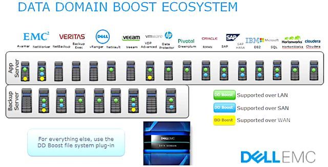 Data Domain Boost通过分布式重复数据消除处理,可大幅提高吞吐量,减少网络带宽利用率。将部分重复数据消除处理分配给备份服务器或应用程序客户端执行,因而可以显着提高性能,实现更快的灾难恢复就绪速度。借助Data Domain Boost的先进能力,Dell EMC还成就了Data Domain Boost的生态系统。