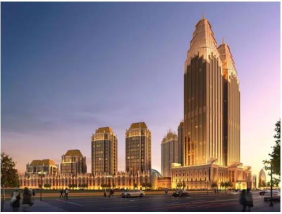 建筑面积约6万平方米,双子塔形态的超五星酒店,一栋由香格里拉酒店集团经营管理,另一栋是好莱坞主题酒店。其中会议中心约1万平方米,一到五层的立面效果展现白金汉宫建筑风格,形成中心形象标志。