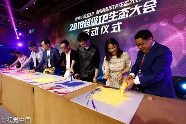 2018年4月26日, 2018超级IP生态大会启动仪式在北京万达文华酒店隆重举办。(左起)熊猫传媒集团CEO、联合创始人吴孝明,WE Marketing Group 创始人&CEO陈一枬,CAPCOM版权方负责人边力先生,九九互娱营销顾问股份有限公司董事长李晓东,Gululu创始人兼CEO江志强,中国网球公开赛内容版权部总经理高扬,乐创文娱高级副总裁陈肃,品源文华创始人张璐,超级IP生态大会创办人方立军,9位大咖一同登台,用彩色沙粒洒下对2018超级IP生态大会的美好期盼,借助沙粒画聚少成多的美好寓意,预祝大会成功举办,为IP行业创造更多精彩。