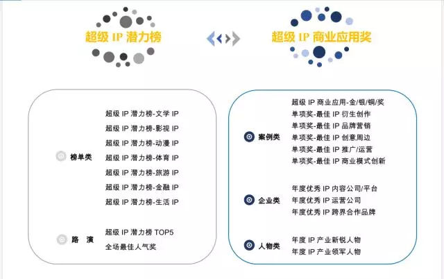 主要针对拥有成熟的IP商业化运作经验,且已取得一定的行业影响力及市场效果的IP应用案例、运营公司/机构/平台以及人物等,能够成为行业的标杆和典范。