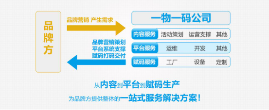 过往品牌商在和一物一码平台合作之后仍然需要对接印刷厂、广告公司等第三方服务商,而一物一码数据(广州)实业有限公司则可以实现内容+平台+赋码一体化,大大降低企业沟通成本和运营成本。