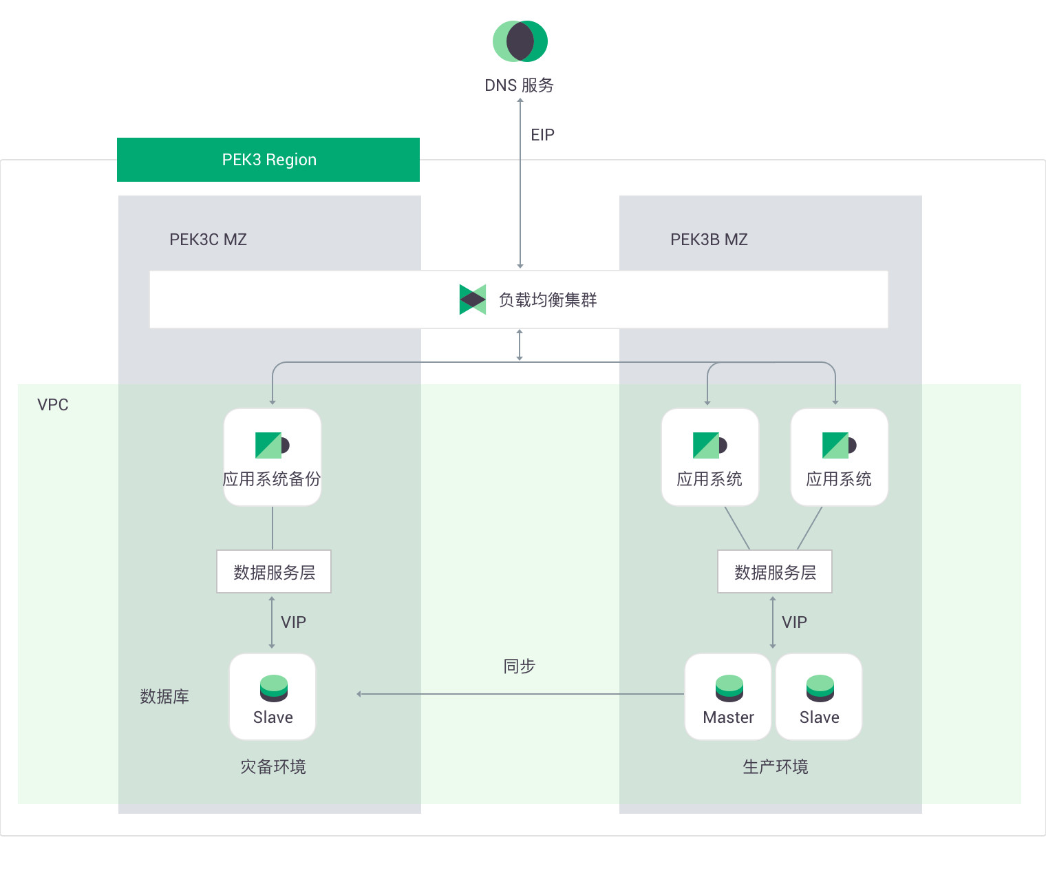 业务系统分别部署在 QingCloud 同城的不同可用区内,如北京 3 区-B 和北京 3 区-C ;
