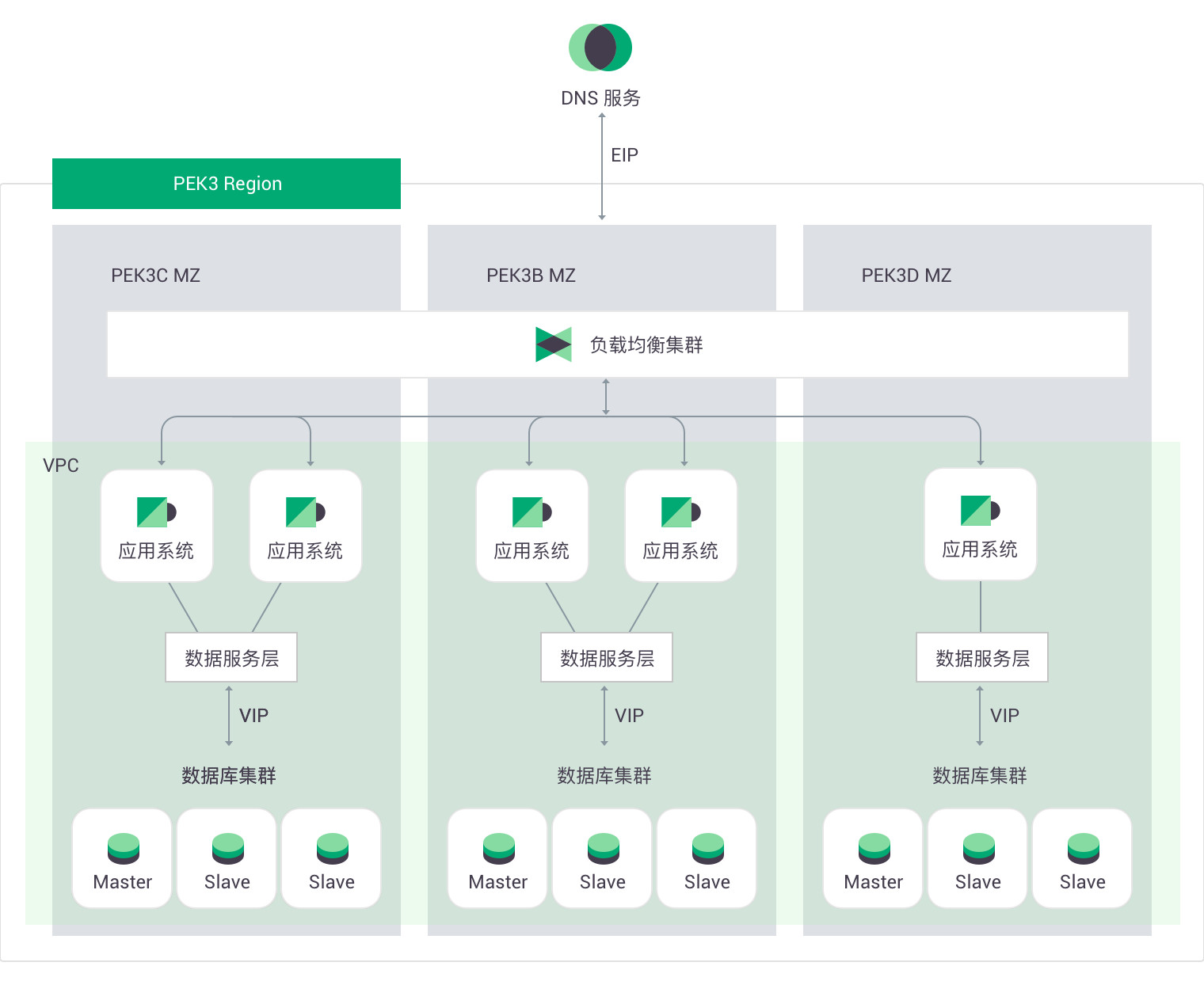 目前,在北京 3 区域内的可用区(北京 3 区-B、北京 3 区-C)之间,用户可通过支持多可用区部署( Multi-AZ deployment,简称 MZ )的网络与应用服务,快速实现系统架构的多可用区部署,轻松构建多活及灾备业务架构,从?避免因机房事故导致业务中断。