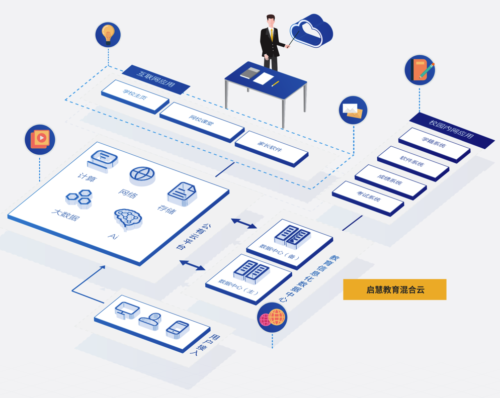 启慧教育混合云解决方案是将校园总体IT资源云平台,通过VPN专线互联等网络方案进行强力整合、协同资源、促进云网融合。混合云解决方案可充分利用公有云计算资源、网络资源的弹性灵活,同时核心数据保存在本地数据中心,满足行业监管及合规性要求,适用于存量IT资源的合理利用、业务调整架构平滑过渡、跨数据中心灾备等场景。