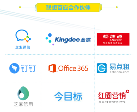 此外,依托联想丰富的资源,百应具备赋能各种发展型企业的实力,有利于获得更多合作资源和机会、促进实现多方战略合作伙伴接入,现已与包括腾讯企业微信、金蝶云之家、用友畅捷通、阿里钉钉、微软Office 365在内知名企业建立了合作伙伴关系。