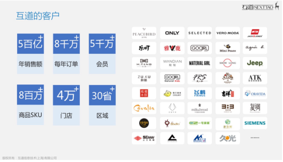 互道信息是专注零售行业的数据应用服务商,主要解决品牌商扩张时“人货场”遇到的挑战。品牌零售商经常遇到缺货与积压并存、店员流动频繁,业绩突出的好店长,运营数据无法实时抓取这一系列难题;还包括商家因为不掌握用户信息从而造成的无法提供个性化服务的难题。针对这些挑战,互道信息开发了门店智能移动POS终端“盈力ShopForce”,智能配补货终端“品力StockForce”,企业数据智能引擎“源力DataForce”,全渠道会员中心“众力FansForce”,智能搭配助手“悦力JoyForce”五项产品,完美解决客户遇到的一系列问题。