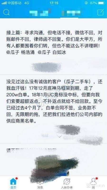 就在5月初,有位自称是瓜子二手车供应商的公司员工,曾爆料瓜子拖欠了他们200万的业务款,电话不接,微信不回,对账邮件不回,律师函也不回,非但如此,还将他们拉进了黑名单。