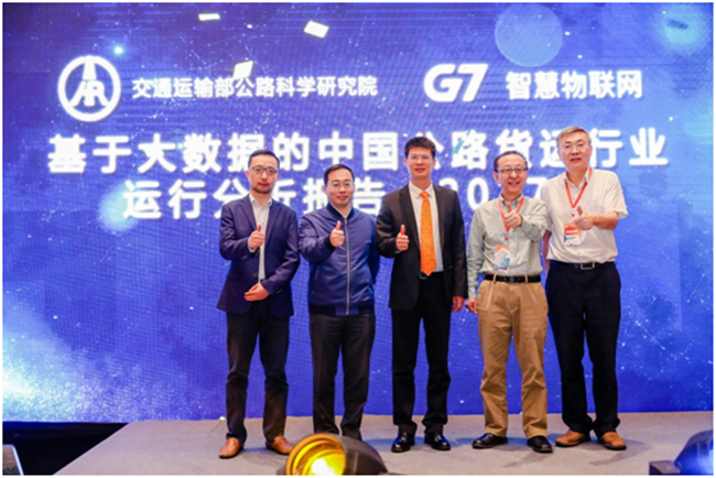 交通运输部公路科学研究院党委书记副院长杨文银在大会致辞,并携众嘉宾开启“基于大数据的中国公路货运行业运行分析报告”发布会,并合影留念。