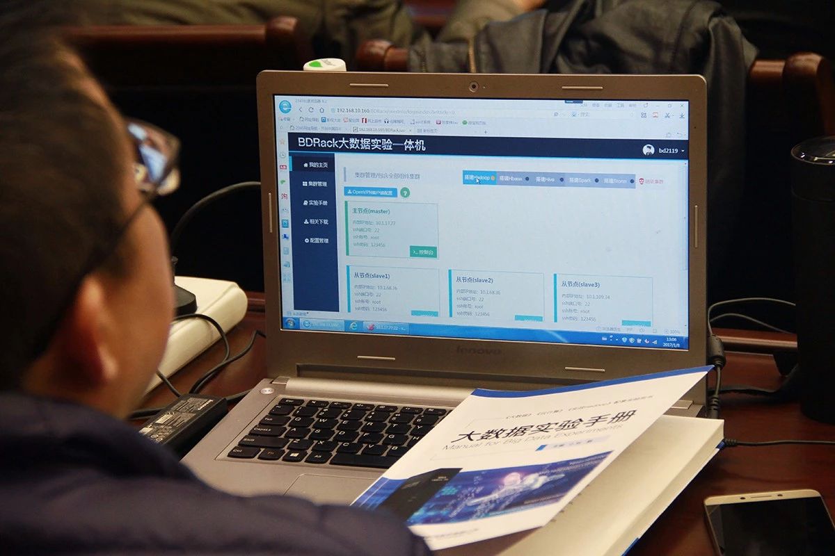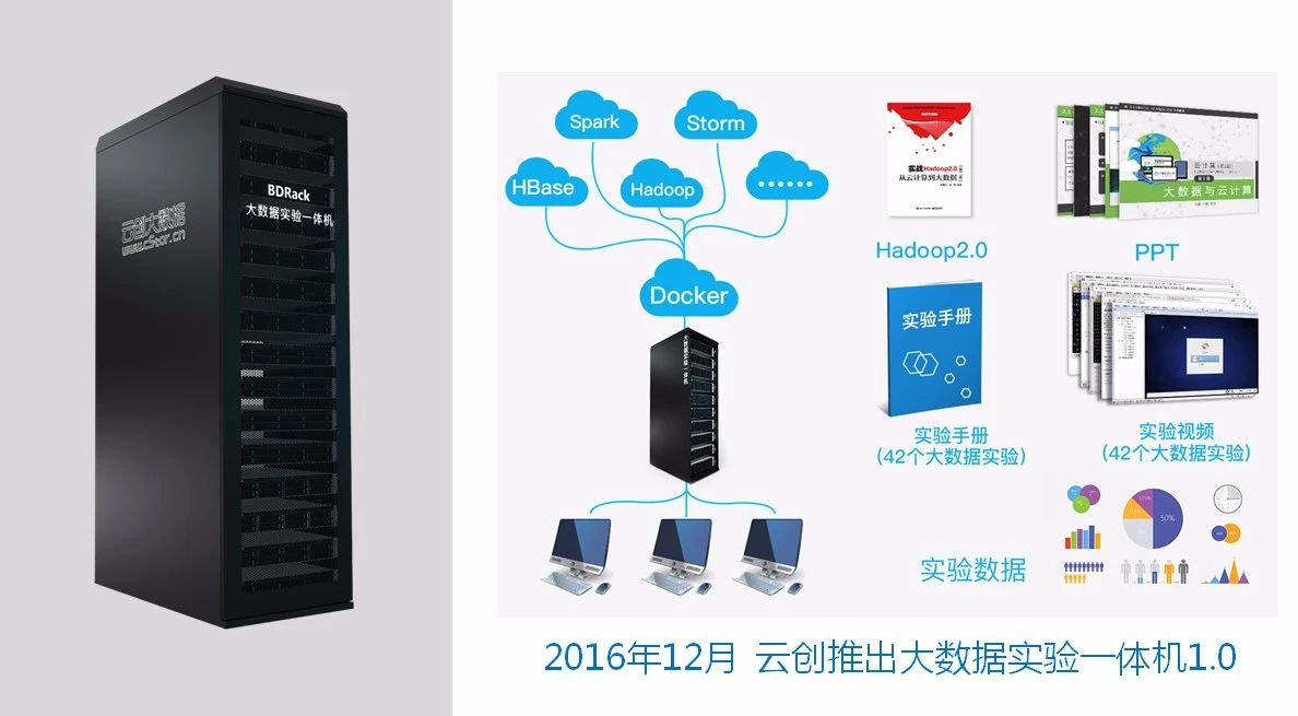 与此同时,为了解决大数据实验难的问题而开发的大数据实验平台,正在为越来越多高校的教学科研带去方便:2016年,刘鹏教授带领云创大数据的研发人员,应用Docker容器技术,成功开发了BDRack大数据实验一体机(http://www.cstor.cn/proTextdetail_11007.html)与大数据实验平台(http://www.cstor.cn/bd/index.html),它打破虚拟化技术的性能瓶颈,可为每一位参加实验的人员虚拟出Hadoop集群、Spark集群、Storm集群等,自带实验所需数据,并准备了详细的实验手册(包含42个大数据实验)、PPT和实验过程视频,可以开展大数据管理、大数据挖掘等各类实验,并可进行精确营销、信用分析等多种实战演练,帮助高校师生在平台上轻松开展大数据教学与实验。