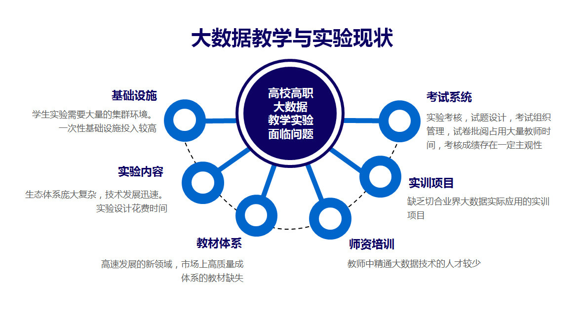 近几年,在大数据人才培养和大数据课程建设方面,由于大部分高校仍然处于起步阶段,遇到了越来越多的发展瓶颈,需要探索的还有很多。首先,大数据是个新生事物,懂大数据的老师少之又少,院校缺“人”;其次,尚未形成完善的大数据人才培养和课程体系,院校缺“机制”;再次,大数据实验需要为每位学生提供集群计算机,院校缺“机器”;最后,院校不拥有海量数据,开展大数据教学科研工作缺“原材料”。