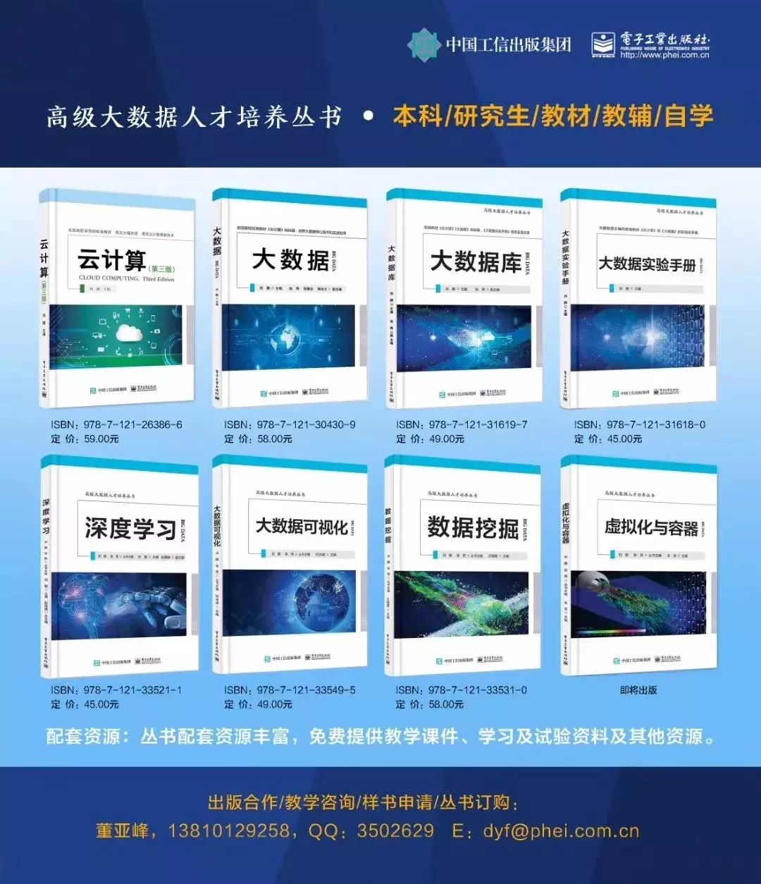 同时,面向全国高职高专人才的大数据教材:《大数据导论》、《云计算导论》、《数据挖掘基础》、《R语言》、《数据清洗》、《大数据实践》、《大数据系统运维》等也正在陆续出版中。此外,人工智能系列丛书也在筹备中。