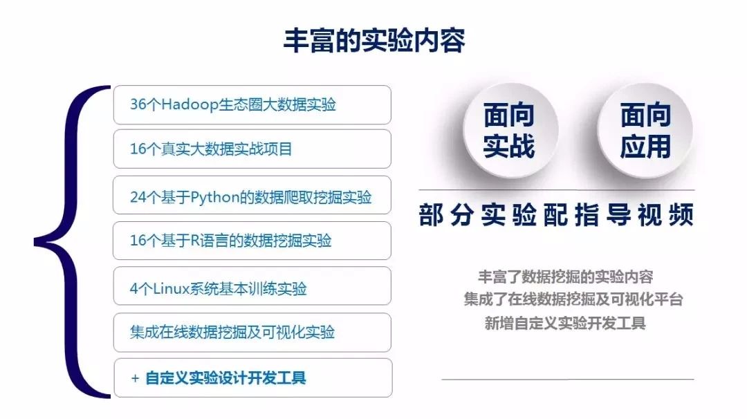 经过两年的更新升级,目前大数据实验平台集成了在线数据挖掘及可视化实验,在今年5月更新的2.1版本中,实验总数已经达到96个,其中包括实战实验21个。同时,平台优化实现了从创建环境-实验操作-提交报告-教师打分的实验流程,新增具有海量题库、自动生成、在线考试、辅助评分的考试系统,以及第三方实验开发工具集、自定义实验板块内容等。