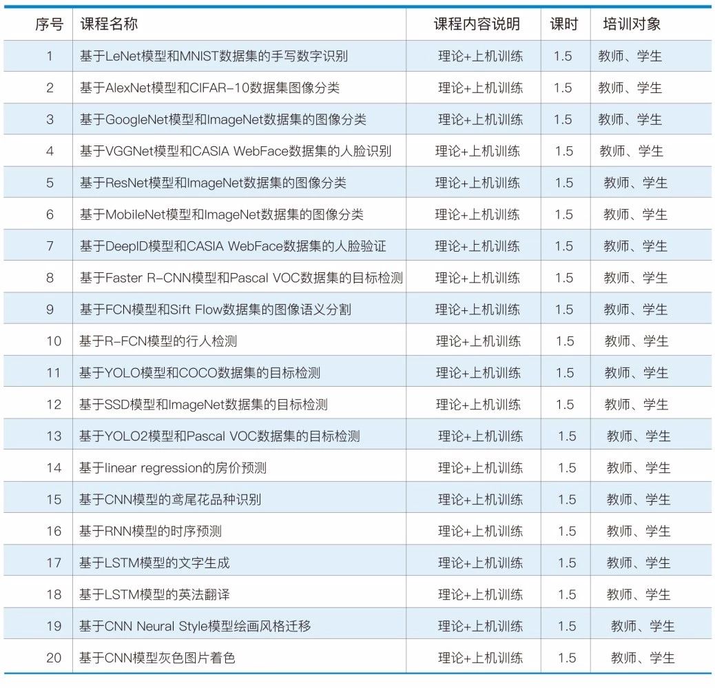 此外,配套实验手册包括20个人工智能相关实验,实验基于VGGNet、FCN、ResNet等图像分类模型,应用Faster R-CNN、YOLO等优秀检测框架,实现分类、识别、检测、语义分割、序列预测等人工智能任务。同时,平台提供《深度学习》配套PPT,内容涉及人脑神经系统与深度学习、深度学习主流模型以及深度学习在图像、语音、文本中的应用等丰富内容。
