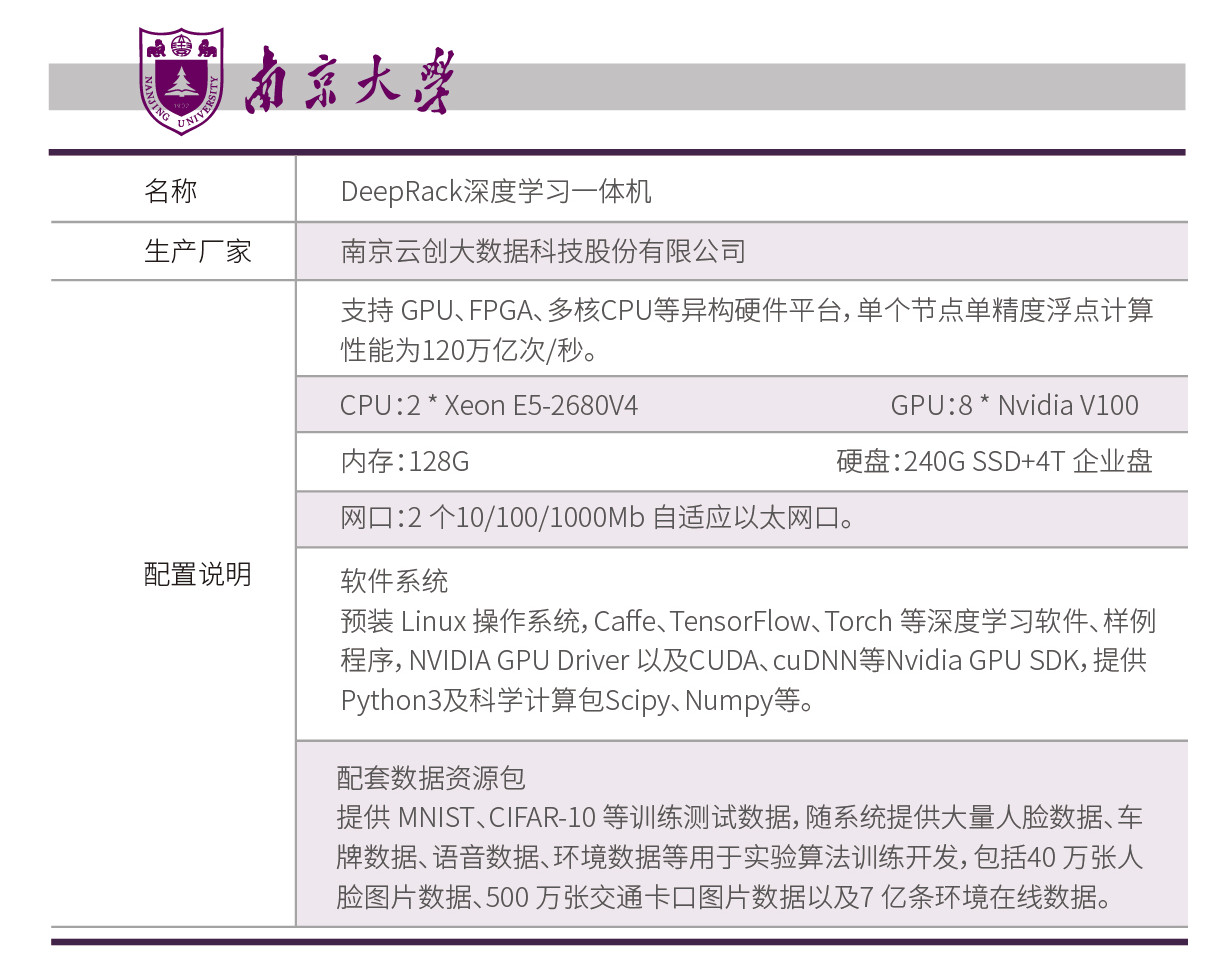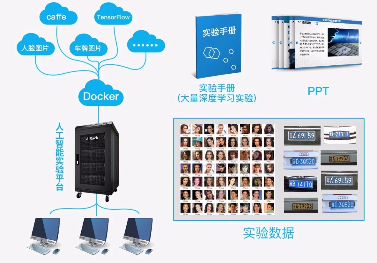 其中,AIRack人工智能实验平台,基于深度学习计算集群,支持主流深度学习框架,方便快速部署训练环境,同时支持多人在线实验,并配套实验手册,同步解决人工智能实验配置难度大、实验入门难、缺乏实验数据等难题,可用于深度学习模型训练等教学、实践应用。