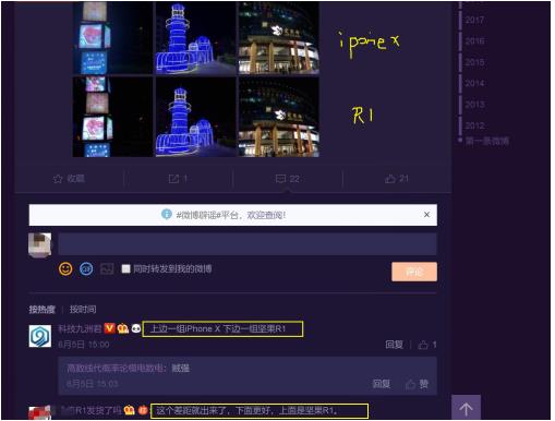 有趣的是,就在其中一位网友这样回复“ 这个差距就出来了,下面更好,上面是坚果R1”时,博主出来回复答案“上面一组是iPhone X,下边一组才是坚果R1”。看来对iPhone X盲目相信的网友要失望了,在夜拍方面iPhone X确实较为薄弱。