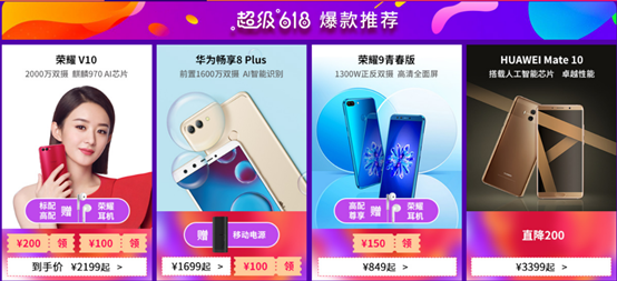 华为商城(vmall.com)超级618活动期间,购买年度旗舰和爆款手机更是优惠多多。入手HUAWEI Mate 10 系列最高直降500元;购买荣耀V10最高直降500元,麒麟970AI人工智能手机,仅售2199元起,标配和高配版均可获赠精美荣耀半入耳式耳机。华为畅享8 Plus 领券减100元,还赠6700mAh移动电源,荣耀9青春版最高优惠350元,高配/尊享版还赠耳机哦~