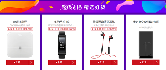 各种潮流配件也有惊喜好礼相赠!荣耀体脂称、荣耀运动蓝牙耳机限时直降70元,华为手环B3限时直降150元,华为10000mAh移动电源爆款推荐!华为全景相机、荣耀音乐小巨蛋活动期间也有不同优惠。