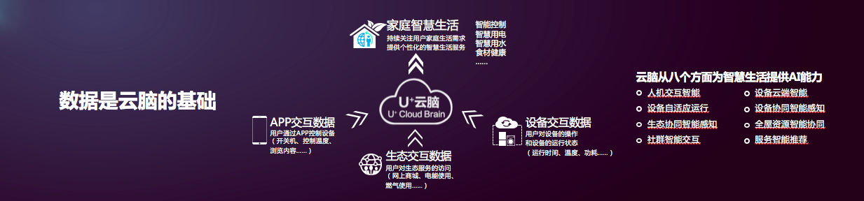 海尔作为率先成功转型物联网企业的代表,在智慧家庭领域人工智能的创新和落地方面走在了行业的前列,为行业推动AI落地提供了范本。在人工智能技术创新方面,3月份发布海尔U+智慧生活X.0平台,作为行业首个智慧家庭的定制平台,以UHomeOS为基础,通过“IoT+AI”双引擎驱动,可以实现定制交互、定制场景和定制服务,打造海尔全屋成套智慧家庭解决方案。其中定制交互就是依托人工智能平台,家庭用户可以根据个性化需求定制智慧生活的交互入口。海尔U+人工智能平台现已向第三方服务开放,包含软硬一体语音方案、智能设备交互服务、硬件数据入口、技能开发接口等方面。另一方面,数据是基础,有了数据才能转化成知识。定制服务主要体现为依托U+云脑实现智慧家庭的主动服务,以U+大数据为基础,知识图谱为核心,让家电能够进行深度学习、自主思考与决策,主动为用户提供服务。