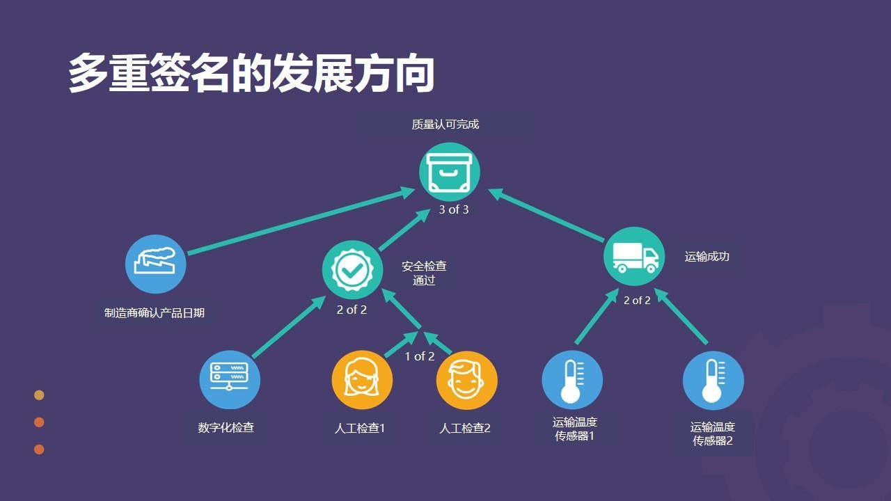 目前多重签名都是一层的,将来的发展方向将是是多重签名支持多层多重签名,比如在制造商运送药品的例子中。集装箱中的传感器每隔5分钟报告温度数据,并将其合并成每日报告。药品只有在其区块链记录显示生产日期、安全检查,并在正确的温度下装运时才能收到其质量认可的二维码。