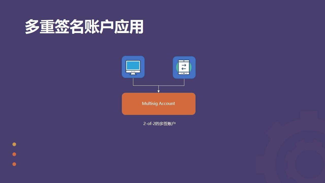 为了解决这个问题,人们发明了多重签名账户技术。多重签名账户,实际上就是将区块链上原来的一个签名对应一个账户,变化成多个签名对应一个账户,这样就可以通过对多个签名验证交易来保证账户的安全性。多重签名账户最多可支持32个共同签署人,可以设置1-32中的任意数签署,交互即生效。例如,如果三个人都有各自的账户,各自的私匙,同时还有一个账户,在变化之前也有自己的私匙,当这个账户变成多中心的账户,把三个人加入到多中心账户中时,多中心账户自己本身的私匙就失效了,同时这三个人的私匙在加入账户同时生效。之后,这可以设定该多中心账号是一个人签署生效,还是两个人签署生效,还是三个人同时签署才能生效,从而为多中心账户提供了相对于单人账户2到3倍的安全保障。多重签名账户不但可以创建还可以编辑,只要提供一个新的账户地址即可,原来的帐户如果离开或者丢失,都可以添加新账户进来,这只需要在界面上删除或变更即可。
