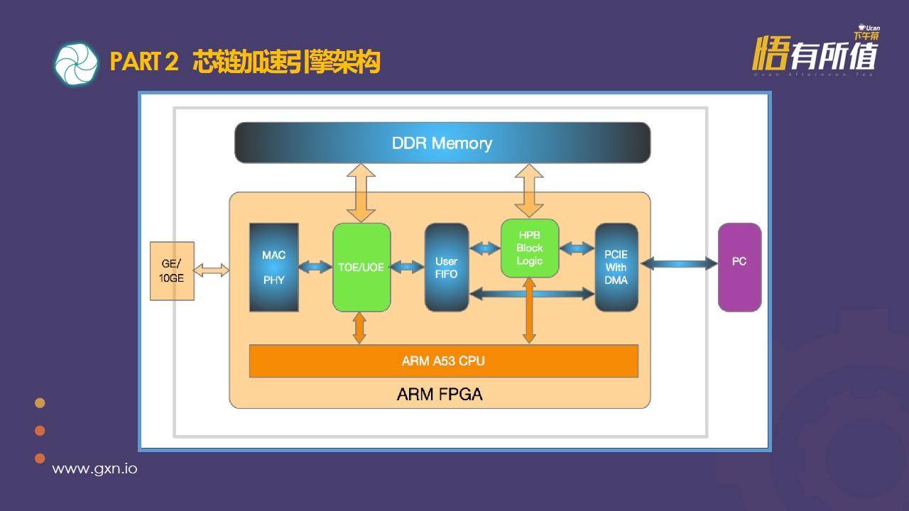 HPB的核心是芯链加速引擎的整体架构,DDR Memory的网络存储。左边是UA网络接口,右边是PC,中间ARM整体解决方案,通过ARM A53 CPU,加上存储和用户ARM FPGA的芯片,有一个ARM FPGA整体解决方案。其中蓝色的部分是中间桥梁,左边的蓝色部分是对外的通道入口,右通道蓝色是网卡芯片,通过芯片的设计,提升了网络的连接,扩展,寻址的能力。可以充分满足区块链交易中的网络带宽需求。通过这样的设计,HPB可以达到百万级的TPS。