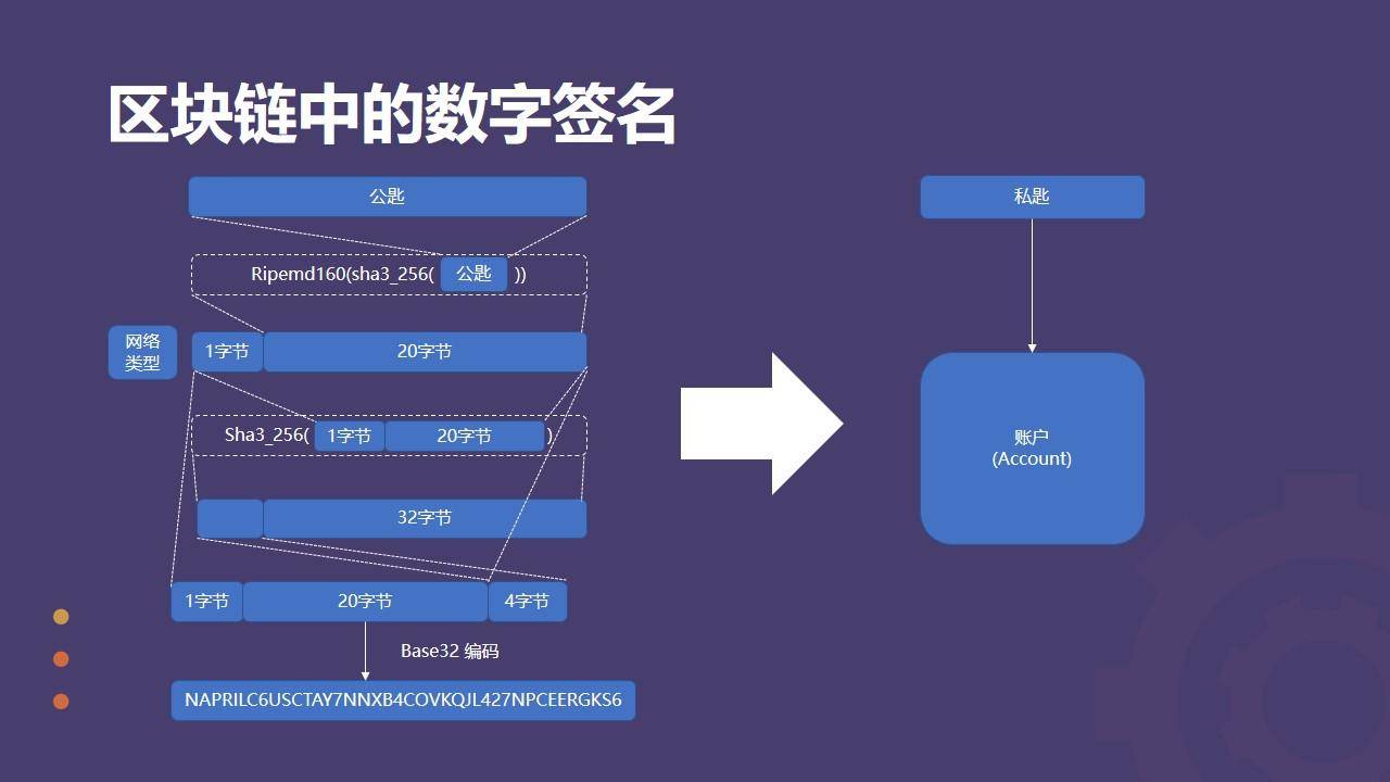 区块链中的数字签名,首先需要把区块链公匙、私匙与区块链账户紧密结合起来,私匙首先算出公匙,公匙通过Ripemd160算法以及两次Sha3-256算法,最后用Base32编码,算出私匙,并直接控制一个账户。这样的好处是显而易见的,对区块链来说,一旦拥有私匙,就完全控制了账户里所有的信息或是内容。但同时,也存在极大的隐患,一旦私匙丢失,将没有任何办法能够把账户再拿回来,因此,私匙的保管是非常非常重要。但尽管大家对私匙的保管都非常重视,私匙泄露或被盗的现象还是经常发生。
