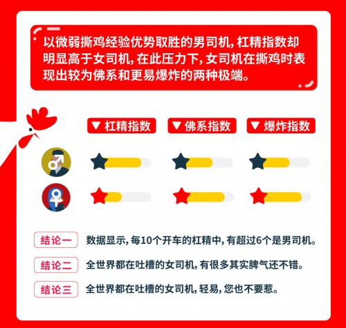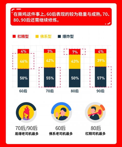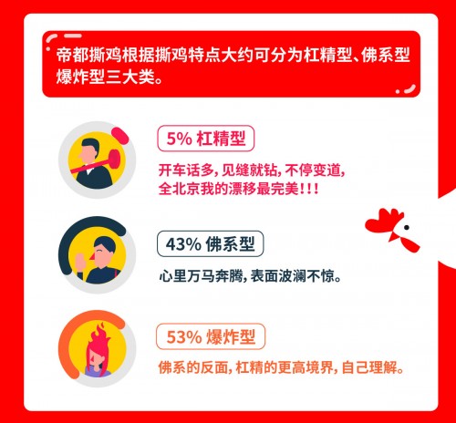 优信《帝都司机图鉴》根据“撕鸡”特点将司机分成三大类:杠精型、佛系型、爆炸型,其比例分别约为5%、43%和53%。