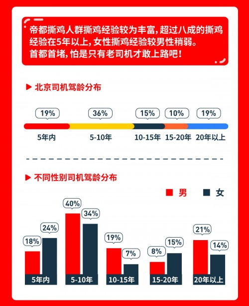 图鉴显示,从年龄上看,北京大多是已过三十而立的80后司机,这一中坚人群占到总司机人群的近一半。五十多岁活跃在“撕鸡圈”也的也不少,有约20%。