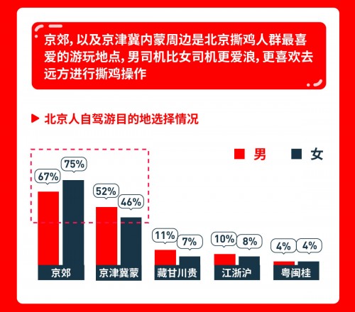 从性别上看,男司机比女司机更爱“浪”,他们中喜欢去远方进行“撕鸡”操作的比例高于女司机。