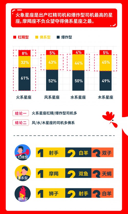 《帝都司机图鉴》还就不同星座的司机进行了分类统计。结果表明,火象星座是多产“杠精”司机和爆炸型司机最高的星座。各星座中狮子座最火爆,而土象星座的摩羯座,更多是稳重温和的佛系司机。