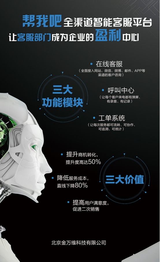 帮我吧是北京金万维科技有限公司在移动互联网、云计算、人工智能等新兴技术正在深度革新各行各业的背景下,为企业用户打造的新一代全渠道智能客服平台。帮我吧拥有机器人客服、全渠道在线聊天、呼叫中心、工单、移动客服、远程协助、数据统计等功能,用一个平台连接电话、手机APP、微信、微博、邮箱、web等所有企业级入口。旨在帮助企业快速连接客户,显着提高工作效率,降低服务成本,抓住每一个销售线索,提高客户满意度和忠诚度,让客户服务真正成为企业利润增长的强大引擎。