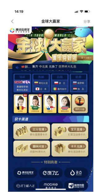 除此以外,应用宝还加入陌陌联合打造《金球大赢家》,参与者只要通过应用宝、陌陌等多个平台进行金球卡的收集,集齐32张金球卡就有机会获取5万元大奖,为大众营造“助威”的互动场景创造助威体验。