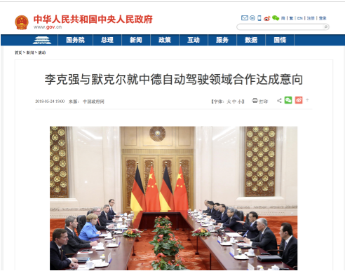今年五月份,李克强总理会见德国总理默克尔,表示中方在自动驾驶、人工智能、车联网等新兴产业领域持开放态度,将严格保护知识产权,愿与德方在上述领域加强合作。