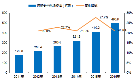 我国网络安全行业市场规模迅速增长。根据智研咨询数据显示,2012-2016年我国网络安全行业市场规模保持20%以上的增速,2016年我国网络安全行业市场规模已达495.8亿元,近五年的复合增长率为22.6%,保持了快速增长态势。