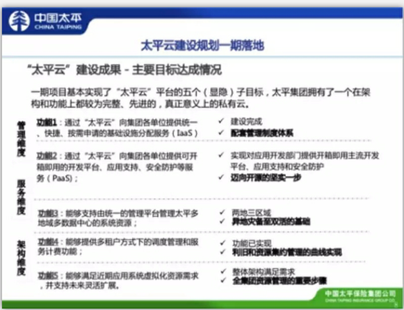 太平云建设规划一期落地,实现了“太平云”平台的五个子目标,太平集团拥有了一个在架构和功能上都较完整、先进的,真正意义上的私有云。