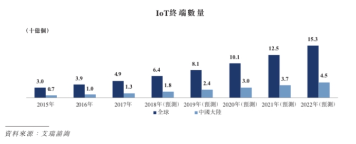 据艾瑞咨询预计,全球消费级IoT硬件销售额由2015年的3063亿美元增长到2017年的4859亿美元,复合年增长率为26%,预计到2022年,将达到15502亿美元。消费相关的IoT应用涵盖资讯及娱乐、保健、智能家居、安保等,由于感应器及设备处理器技术的改良,使物联网成为各种消费产品的标准功能,5G、云基础设施的覆盖及人工智能等将加强物联网服务与应用,预计全球消费级IoT市场将持续倍增。