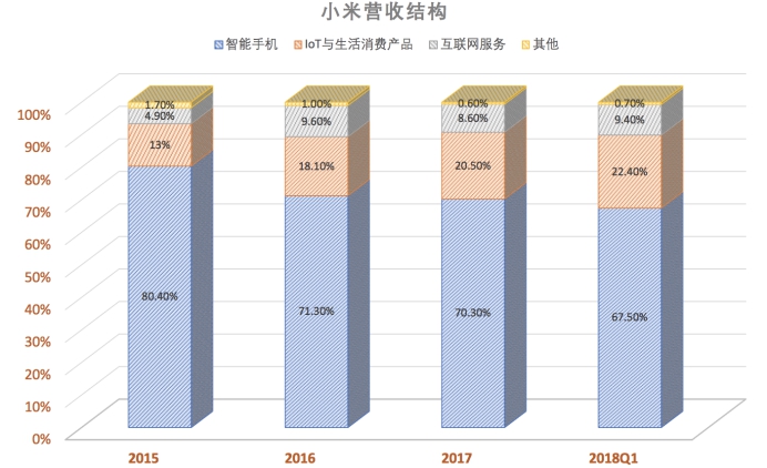 从招股书公布的财务数据来看,2017年小米主要的三个收入业务的部分,其中手机业务占比为70.3%,物联网及生活消费产品20.5%,互联网服务为8.6%。