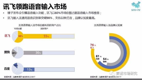 自2016年起,人工智能领域建设上升至国家战略层面,“语音”成为人工智能领域的一大关键词。如今,手机端的输入方式已经发生了巨大变化,语音输入达到了实用的门槛,基于语音的功能创新空间更多,语音交互的比重也越来越大。赛诺数据显示,讯飞输入法成为语音输入法市场中高粘性的产品,活跃用户占比高达55%。