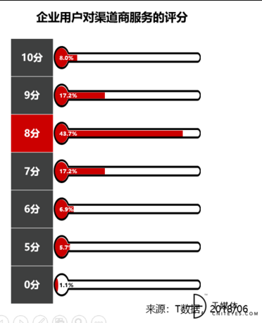 通过T研究的调查结果,T媒体发现,企业用户对渠道商服务的评分集中在7~9分间,平均分数可达7.8分,表明企业用户对渠道商的服务总体还是比较满意的。