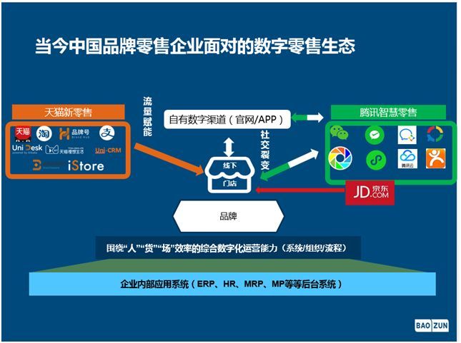 一边有天猫新零售,除了做电子商务之外,打造一种新的商业闭环,帮助品牌做线上线下的融合。同时在另一边腾讯也有智慧零售,除了微信、公众号之外,还有小程序。当然还有京东、抖音,等等。这就是企业所面临的数字零售生态,那么身处其中,我们要做什么样的改变?